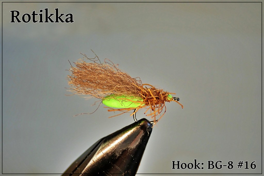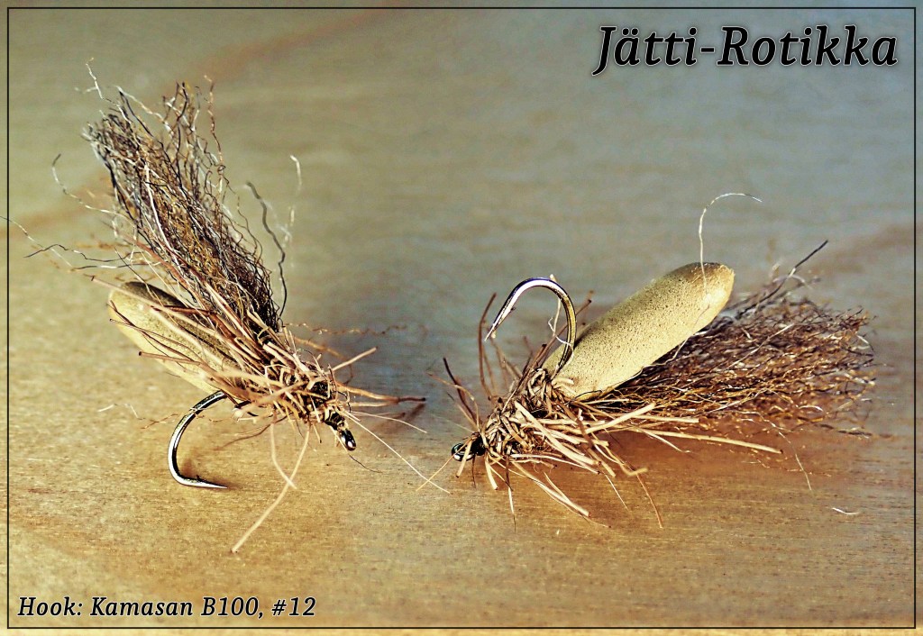 - Jätti-Rotikka on 4-5 mm foamista sidottu, 3-4 cm mittainen, suurten vesiperhoslajien jäljitelmä, joka on varsinainen täky loppukaudesta.
