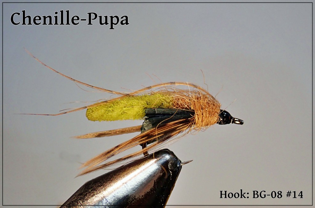 Chenillepupa on luonnollisen näköinen pupajäljitelmä, monen kalastajan luottoperho. Perholla kalastetaan pinnan tuntumassa.
